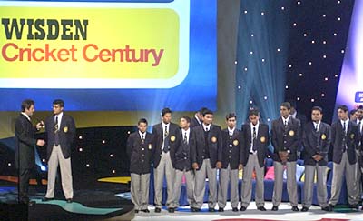 Skipper Sourav Ganguly is interviewed by Mark Nicholas as his Indian team mates watch from the adjoining dais. After winning the NatWest Triangular Series, the team, quietly confident, hopes to win the Test series against England too.