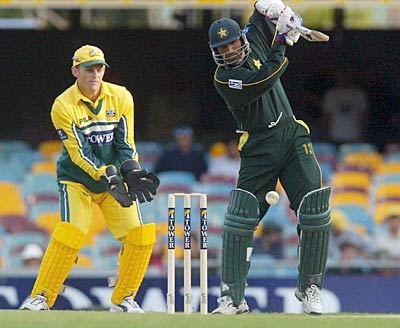 Yousuf Youhana plays a drive on his way to an unbeaten half-century. Youhana was the second highest scorer in the Pakistan innings with 61 runs.