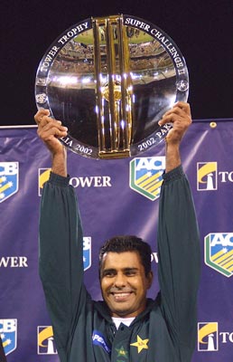A beaming Waqar Younis holds up the Tower trophy for the Super Challenge II series.