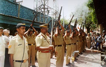 A Gandhian Bids Farewell Policemen fire a volley of shots as a champion of ahimsa is cremated in Bombay on Sunday. Photographs: Jewella C Miranda BACK NEXT |