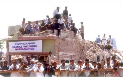 Folks of Anjaar gathered on a partially-collapsed building, patiently waiting in the burning sun for the Clinton convoy to arrive. Plenty of criticism of the Gujarat government did the rounds. Some felt that the money that Clinton came to give Gujarat, on behalf of the American-Indian Foundation, would be wasted