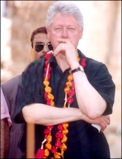 Clinton stands surveying the scene near Jubilee Hospital at Bhuj. The debris of the civil hospital, which was destroyed completely in quake, lies close by. Cheering crowds greeted Clinton wherever he went, amid expectations that the visit would boost relief efforts. Clinton went through Bhuj's devastated streets holding out his hands to children
