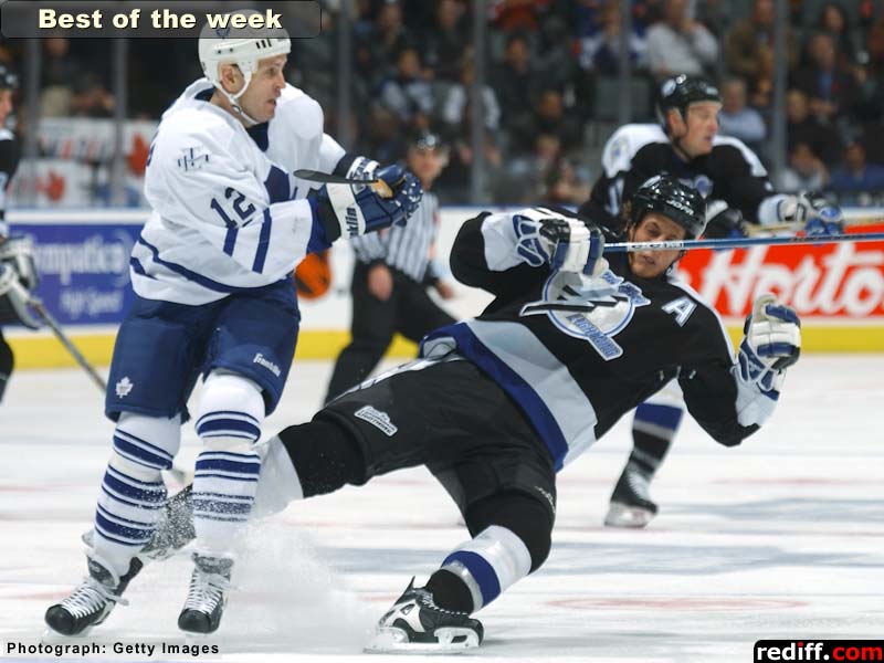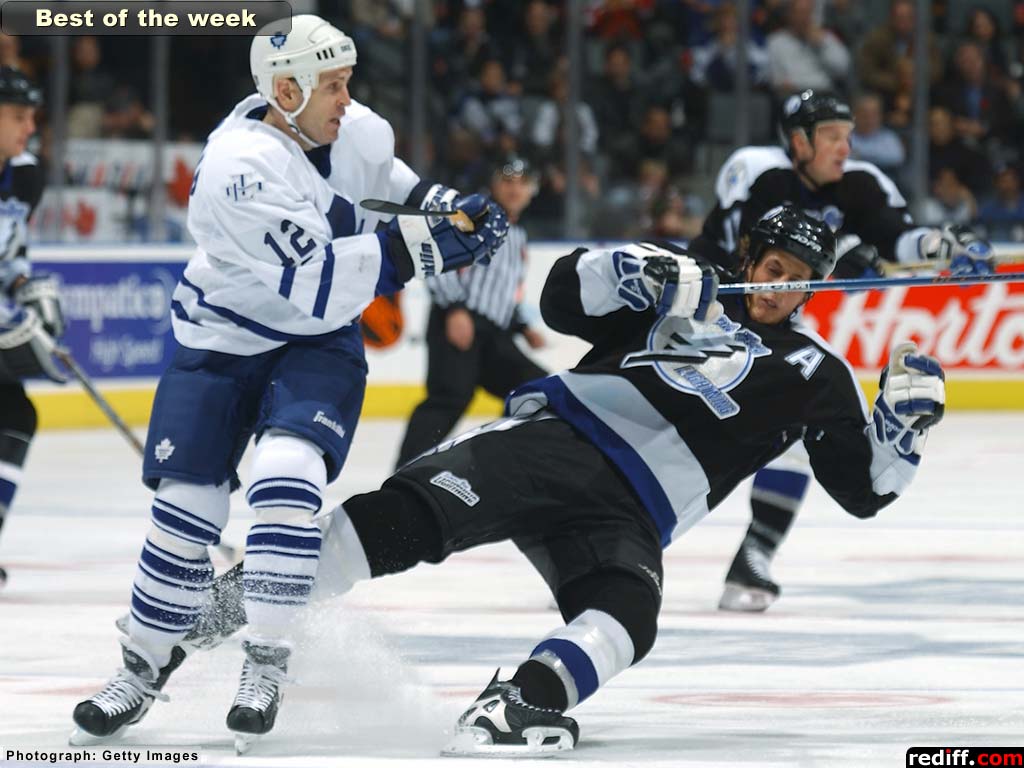Right wing Tom Fitzgerald #12 of the Toronto Maple Leafs checks center Vincent Lecavalier #4 of the Tampa Bay Lightning during the game at Air Canada Centre in Toronto, Ontario. The Maple Leafs defeated the Lightning 4-3