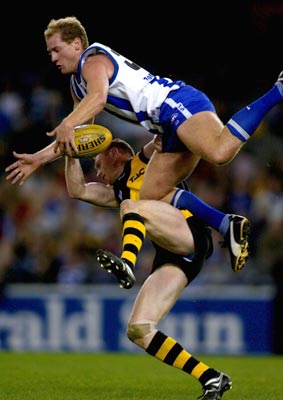 Digby Morrell #32 for the Kangaroos flies for a mark over Craig Biddiscombe #22 for the Tigers during the Round 11 Kangaroos versus the Richmond Tigers AFL match, played at Colonial Stadium, Melbourne, Australia.