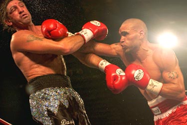 Anthony Mundine of Australia connects a fight winning hit on Darren Obah of Australia held at the Whitlam Centre, Sydney.