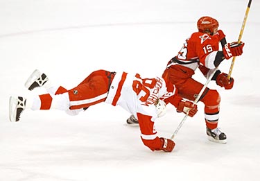 Tomas Holmstrom #96 of the Detroit Red Wings hooks Kevyn Adams #15 of the Carolina Hurricanes with his stick during game 2 of the 2002 Stanley Cup Finals at Joe Louis Arena in Detroit, Michigan.