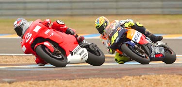 Max Biaggi of Italy and the Marlboro Yamaha M1 team leads Valentino Rossi of Italy and the Repsol Honda team during the French Grand Prix, a part of the World Motorbike Championship held at Le Mans, France.