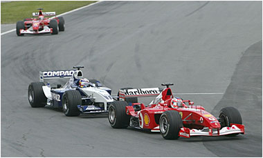 Barrichello goes past BMW Williams driver Juan Pablo Montoya of Colombia early in the race.