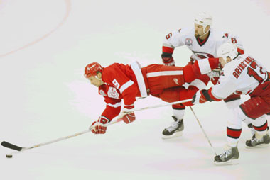 Steve Yzerman #19 of the Detroit Red Wings flies through Bret Hedican #6 and Rod Brind'Amour #17 of the Carolina Hurricanes during game 4 of the NHL Stanley Cup Finals at the Entertainment Sports Arena in Raleigh, North Carolina.