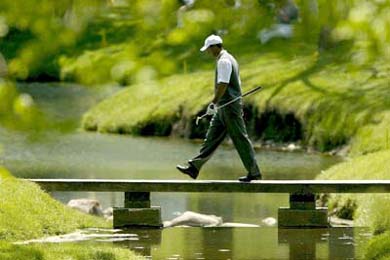 Tiger Woods walks across a bridge on the third hole during the first round of the Memorial tournament at Muirfeild Village GC on May 23, 2002.
