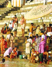 Praying. Bathing. Eating. Morning abolutions... All these activities go on at Varanasi's 70 ghats, most of them bathing ghats. The ghats are used by a variety of people, for a variety of reasons. By sadhus. By dhobis or laundrymen. For cargo. By passengers. For commerce.